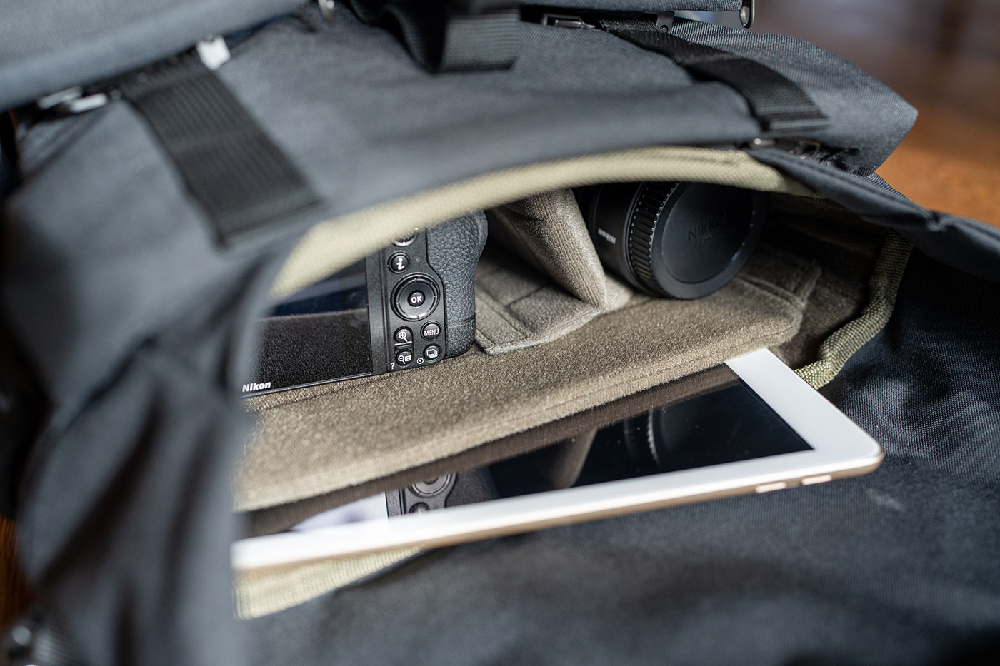 Wotancraft camera bags feature a proprietary Fidlock mechanism that gains you access to the main compartment. This mechanism is quick, convenient, and works so well it will no doubt achieve legendary status soon. To open, simply press the centre of the buckle and it separates, then bring the halves together again and they snap closed magnetically. Genius!
